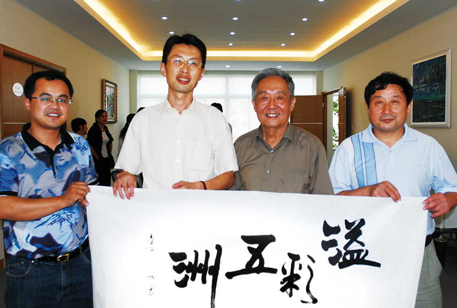 2007年,原全國政協(xié)常委、九三學(xué)社中央副主席、北京大學(xué)博士生導(dǎo)師 金開誠 先生(右二)到鳳凰畫材考察調(diào)研,并為公司題寫“溢彩五洲”;